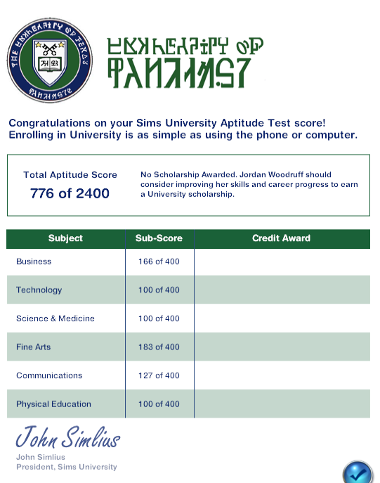 Her uni test results. She went for a business degree bc that benefits the Criminal career track.