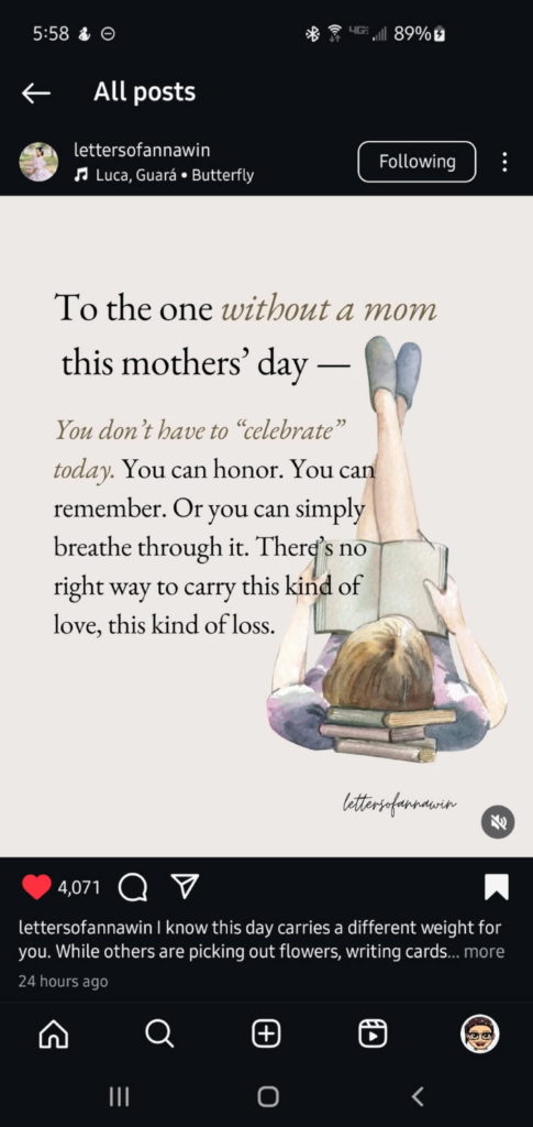 Someone sent me that picture above and somehow, it made me feel okay about today. I suppose today wasn’t as bad as I might make it sound, being that when she was alive, Mom really didn’t care much for Mother’s Day or anything we might have done to celebrate it. So, in death, I still don’t make a spectacle or event of Mother’s Day. To me (and I guess to her, had she still been alive), it’s just another Sunday on the calendar. I think about Mom all the time, so really, today really wouldn’t be unlike any other day.