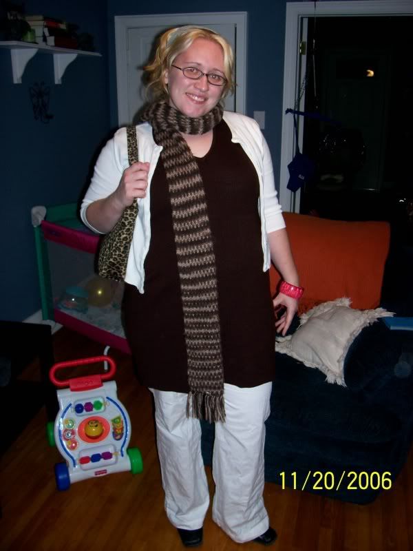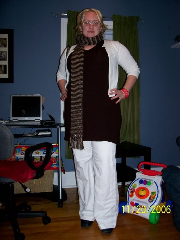 next, i tried it with brown (yes, they are brown) pants, a scarf, and a cardigan. i should’ve put some shoes on.