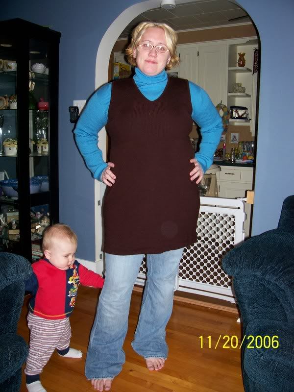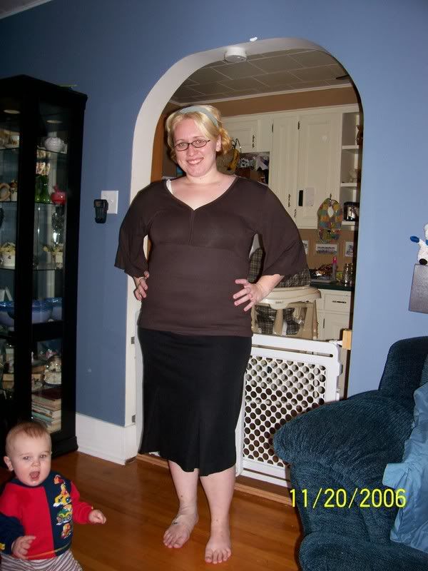 and just for fun, i tried on my new top from tommy hilfiger. it would obviously look better with a real bra (i just got a really nice one) but today was a lazy day and i have a sports bra on. i think that perhaps the skirt is too tight still (damn this baby weight.) it has some nice detail on the bottom and i thought that top would really be best with a pencil skirt (the skirt shown is a bit more tulip than pencil but kind of a mix.) obviously, heels are needed.