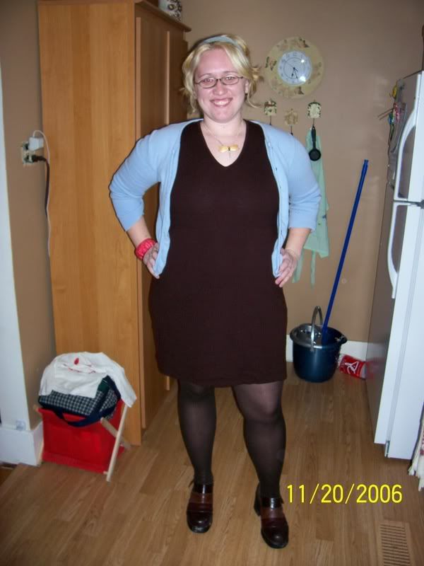 i thought to myself, is it too short to be a dress? perhaps not, self. i tried it out to see with brown tights (they are somewhat textured) and a couple different pairs of shoes.