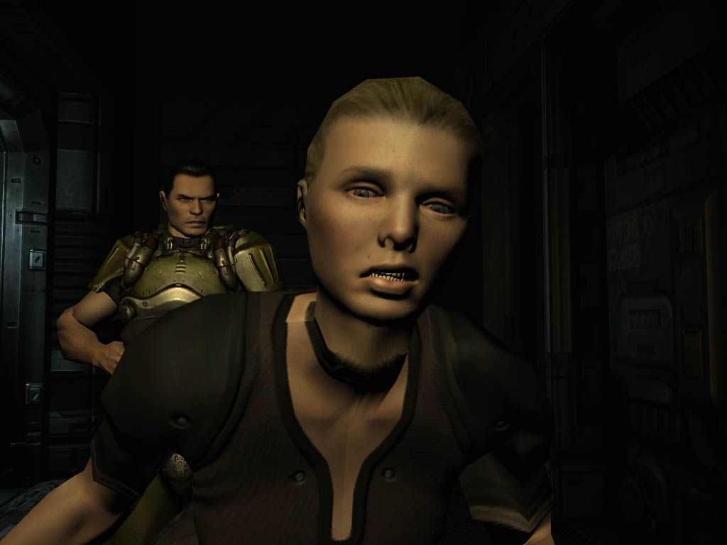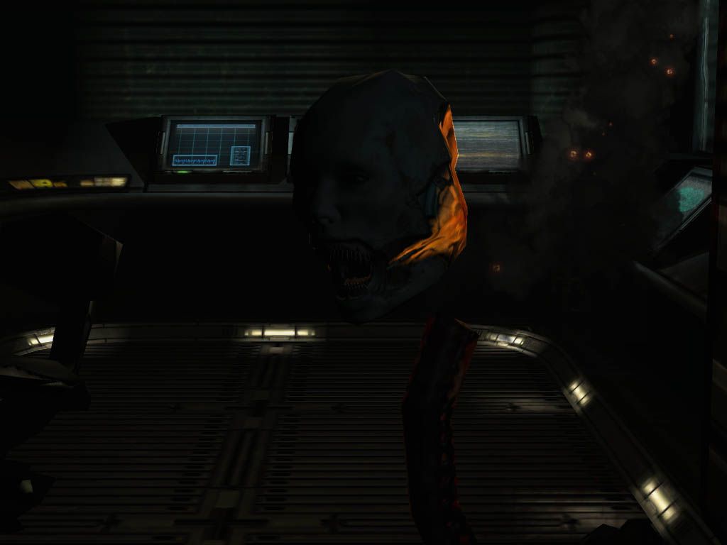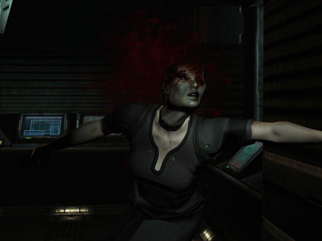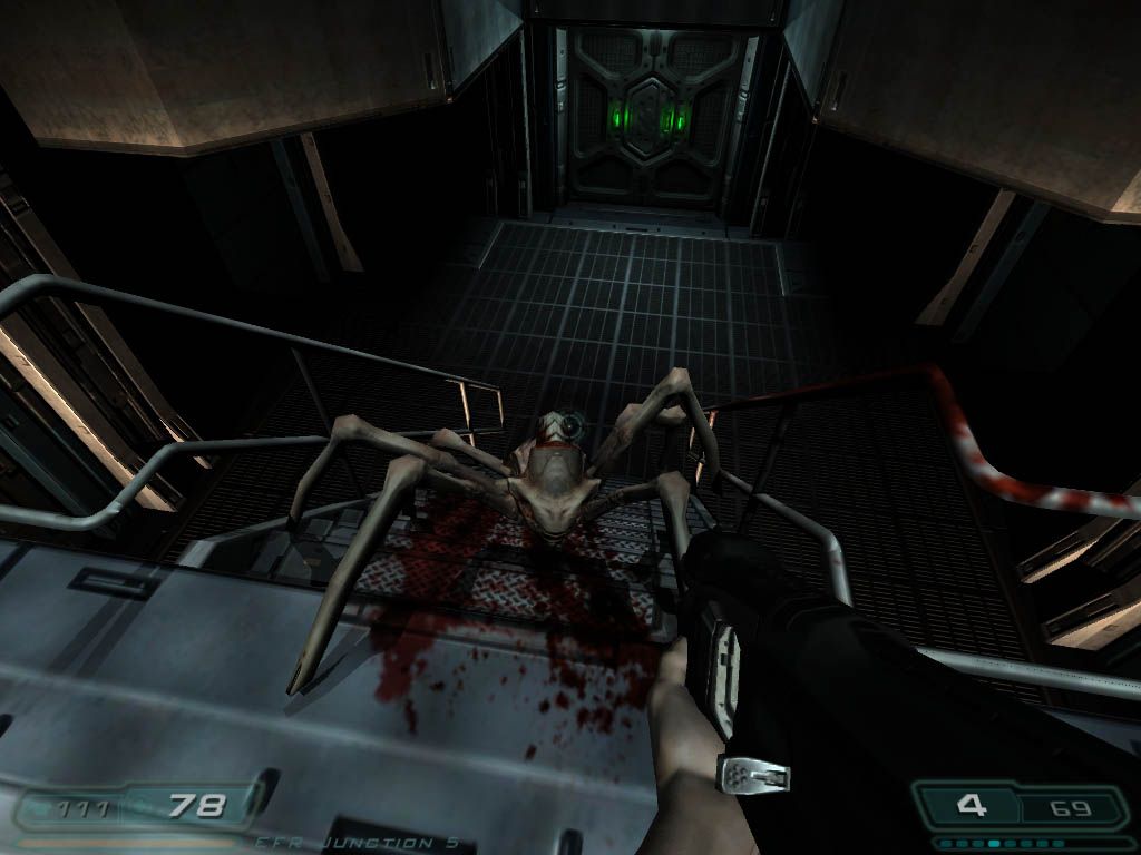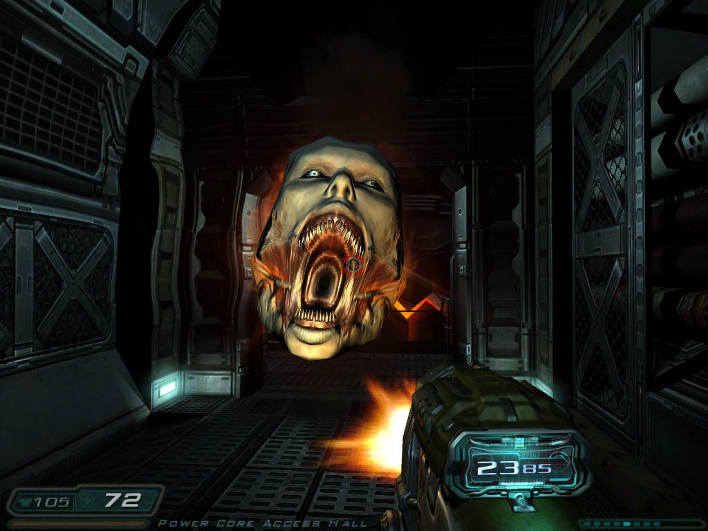 You can only appreciate the graphics in screenshots, I swear. The battle lasted maybe thirty seconds, and I spent that time circle-strafing while firing my heavier machine gun at her head. I have the plasma gun now, but I’d rather not waste my shots. I’m using my machine guns when I can, and conserving my shotgun shots. Because when I’m running around with a flashlight, the shotgun is the weapon I want to switch to most often.